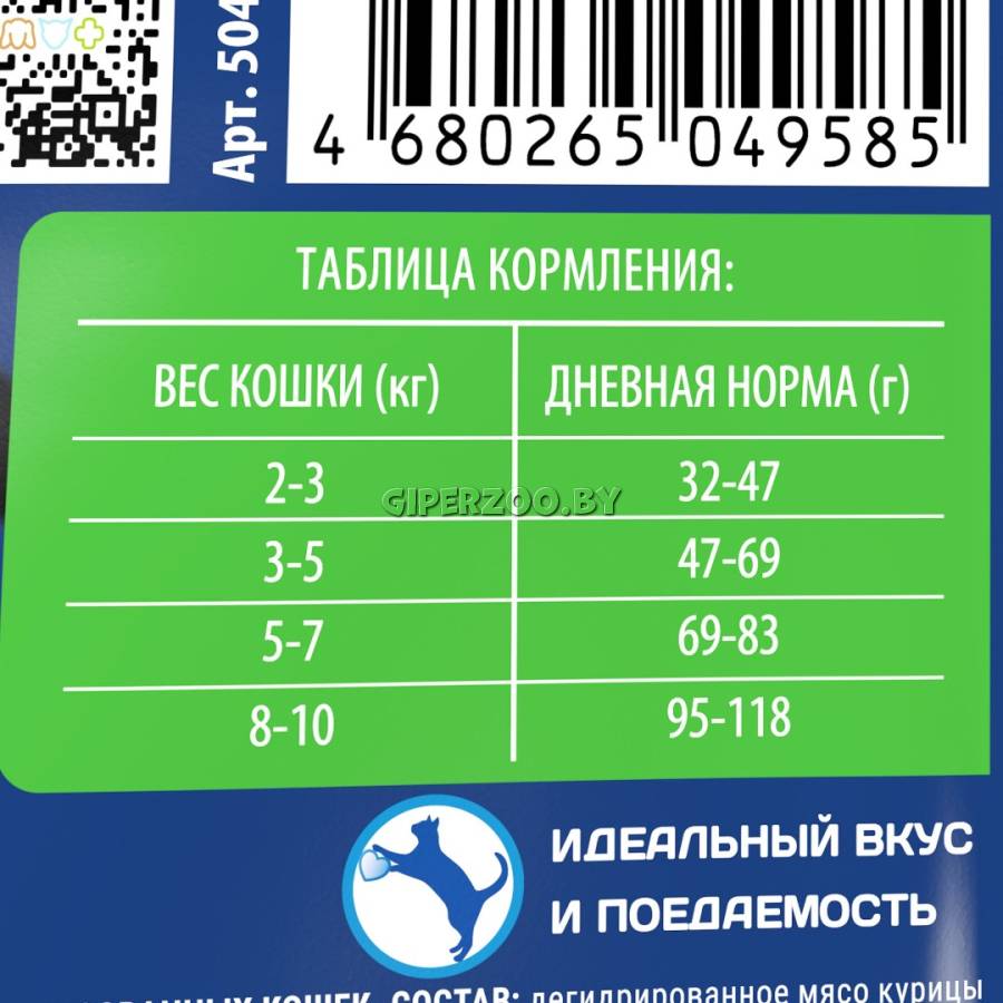 Аналитический состав: белок 34 г, жир 12 г, клетчатка 2 г, зола 6,5 г, са 1,5 г, P 0,8 г. Питательные добавки на 1 кг: витамин А 20480 МЕ, витамин D3 624 МЕ, витамин Е 432 мг, витамин К3 0,16 мг, витамин B1 (тиамин) 3,36 мг, витамин B2 (рибофлавин) 2,4 мг, витамин B6 (пиридоксин) 1,52 мг, витамин B12 (кобаламин) 0,016 мг, Ниацин (Никотиновая к-та / витамин РР / в3) 24 мг, Пантотеновая к-та (витамин в5) 3,52 мг, фолиевая к-та (витамин в9) 0,48 мг, биотин 1,08 мг, Холин (витамин в4) 1232 мг, Железо (Fe) 27,2 мг, Марганец (Mn) 32 мг, Цинк (Zn) 86,4 мг, Медь (Cu) 6,4 мг, Йод (I) 2,16 мг, селен органический (Se) 0,112 мг, DL-метионин 100 мг.