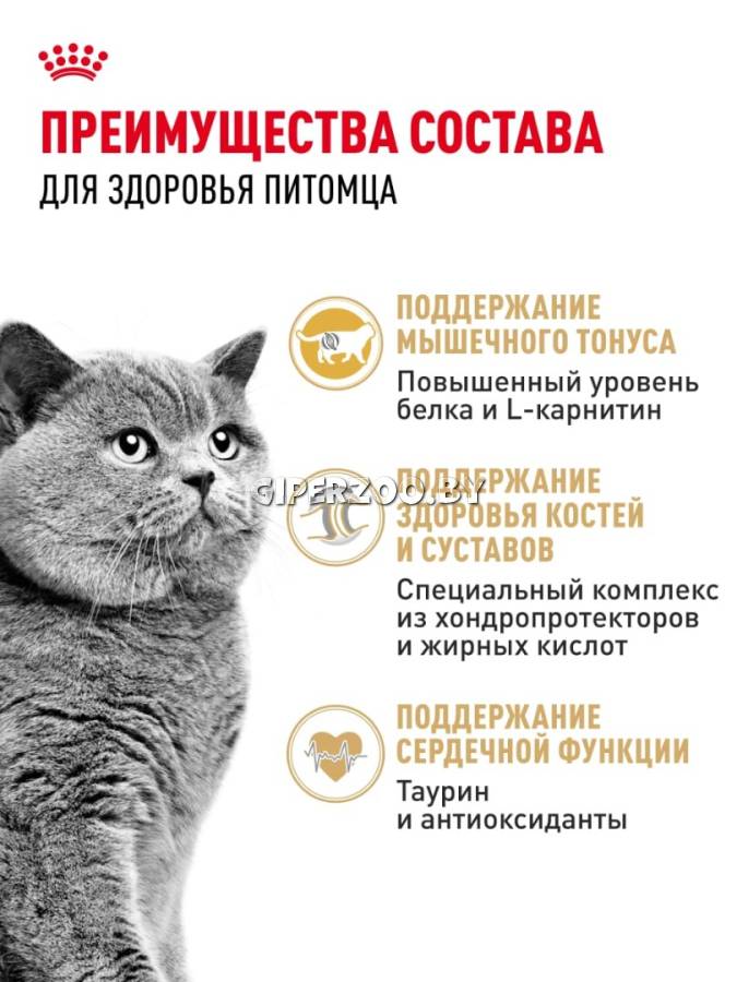 - Поддержание мышечной массы: Благодаря адаптированному содержанию белка, корм помогает поддерживать сильное и мускулистое телосложение, характерное для британских короткошерстных кошек.