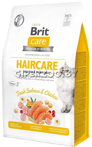 Brit Care Cat GF Haircare Healthy & Shiny Coat (Лосось, курица), 2 кг - гипоаллергенный корм со свежим мясом лосося и курицы для взрослых кошек, шерсть которых требует дополнительного ухода.