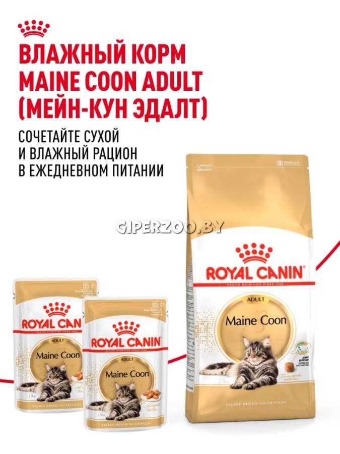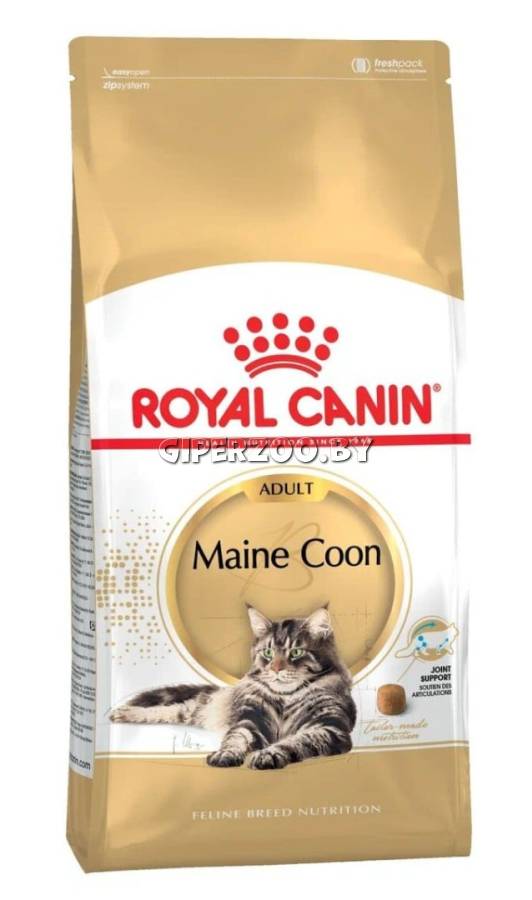 ROYAL CANIN® Maine Coon Adult обогащен таурином, а также ДГК и ЭПК (жирными кислотами омега-3), поддерживающими функцию сердечно-сосудистой системы. Крупные размеры и характерная форма челюстей мейн-кунов приводят к тому, что эти кошки захватывают и разгрызают корм особым образом.