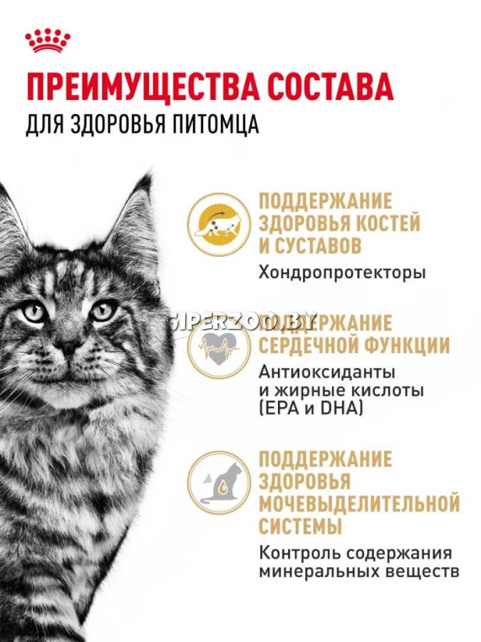 Формула продукта ROYAL CANIN® Maine Coon Adult разработана с учетом индивидуальных потребностей кошек породы мейн-кун. Из-за крепкого скелета и хорошо развитых мышц мейн-куны весят втрое больше обычных кошек.