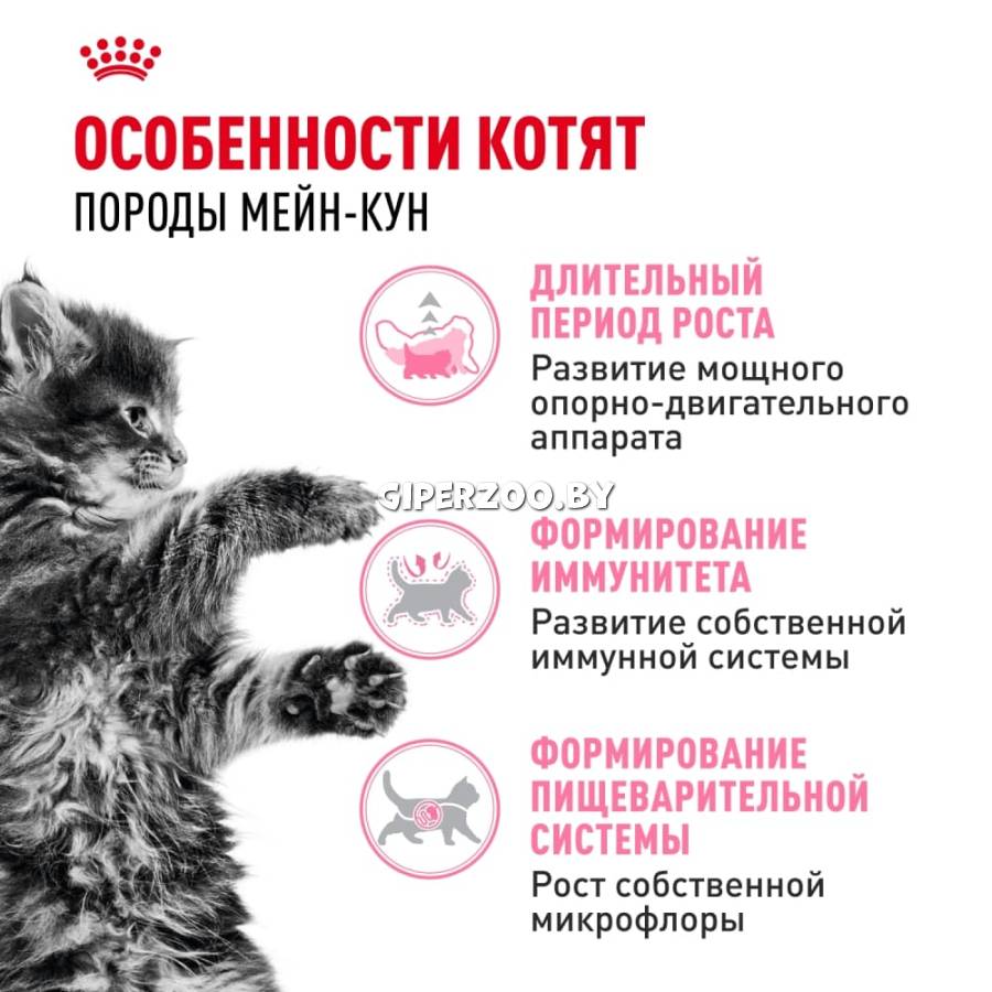 Киттен мейн кун: сухой корм специально для котят породы Мэйн Кун (в возрасте до 15 месяцев). Продукт учитывает потребности животных этой породы, связанные с возможной предрасположенностью к заболеваниям, особенностями анатомического строения и пищевого поведения.