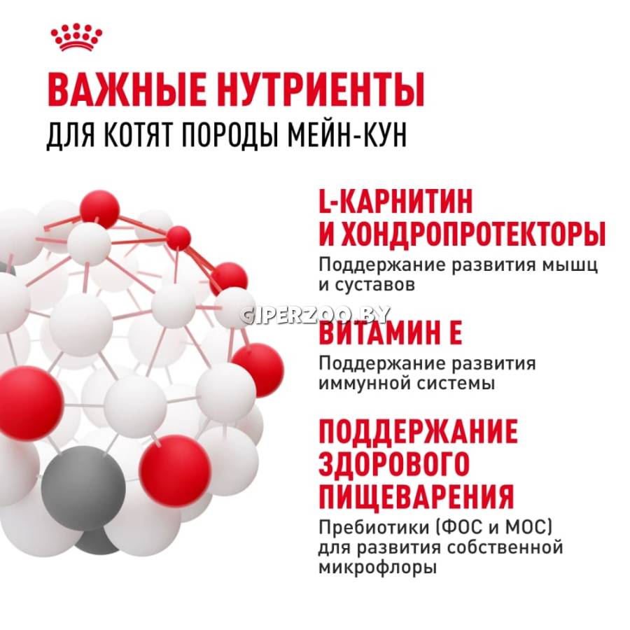 - Пищеварительная система кошек развивается постепенно – у маленьких котят она еще не до конца сформирована. Поэтому им требуется корм, содержащий качественные, хорошо усваиваемые белки. ROYAL CANIN® Maine Coon Kitten содержит белки очень высокой степени усвояемости (L.I.P.), а также пребиотики, регулирующие баланс микрофлоры кишечника.