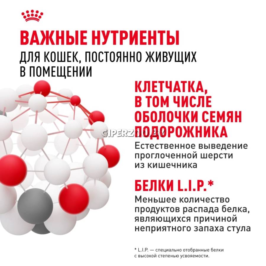 Взрослые кошки, постоянно содержащиеся в помещении, менее активны по сравнению с животными, имеющими доступ на улицу. Вот почему для их здоровья так важен полноценный сбалансированный рацион, богатый ценными питательными веществами. ROYAL CANIN® Indoor 27 содержит белки высокой усвояемости (L.I.P.), уменьшающие объем и неприятный запах стула (последнее особенно актуально для малоактивных кошек в связи с замедленным кишечным транзитом). Умеренное содержание жиров в продукте обеспечивает соответствие между потреблением и расходованием энергии и сохранение нормального веса. Как правило, кошки, живущие в помещении, долго и тщательно ухаживают за шерстью. Благодаря присутствию в составе корма нескольких видов пищевой клетчатки, в частности семян подорожника, облегчается выведение из пищеварительного тракта проглоченной шерсти и снижается вероятность образования волосяных комочков. Состав:пшеница, рис, дегидратированные белки животного происхождения (птица), изолят растительных белков*, мука из зерновых культур.