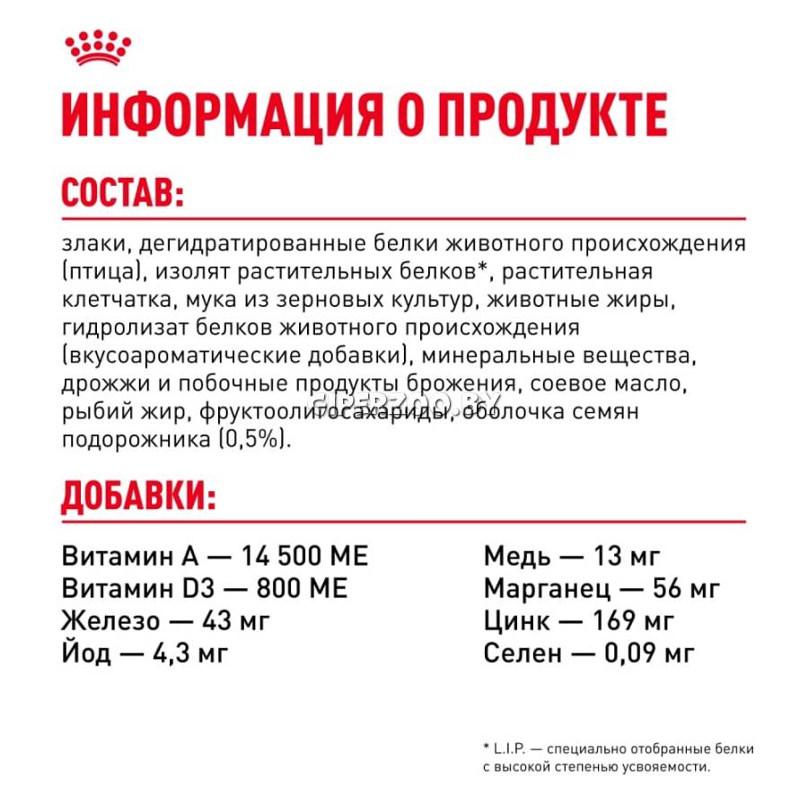 Дегидратированные белки животного происхождения (птица), кукуруза, растительная клетчатка, кукурузный глютен, пшеница, изолят растительных белков (L.I.P. - специально отобранные протеины с высокой степенью усвояемости), гидролизат белков животного происхождения, животные жиры, минеральные вещества, свекольный жом, соевое масло, дрожжи, рыбий жир, оболочка и семена подорожника, фруктоолигосахариды.