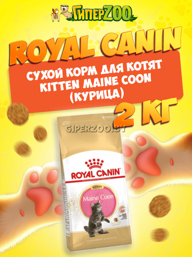 Киттен мейн кун: сухой корм специально для котят породы Мэйн Кун (в возрасте до 15 месяцев). Продукт учитывает потребности животных этой породы, связанные с возможной предрасположенностью к заболеваниям, особенностями анатомического строения и пищевого поведения.