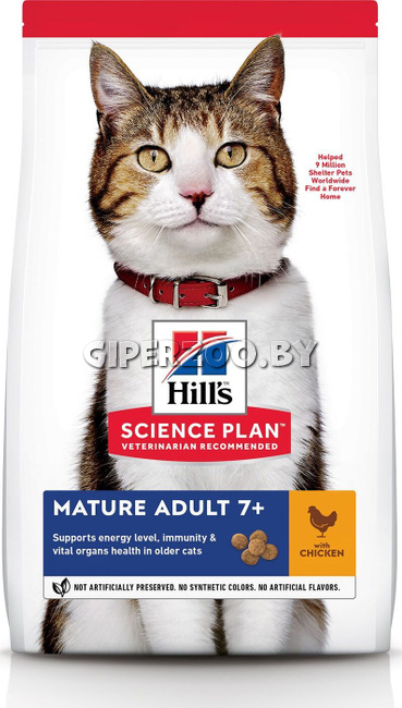 То, что ваш кот или кошка стареет, не означает, что он/она перестает играть. высококачественныйсухой кормдля пожилых кошек и котовстарше 7 лет HILL'S SCIENCE PLAN Mature Adult 7+ - это сбалансированное питание, помогающее бороться с признаками старения у взрослой кошки старше 7 лет.Запатентованная формула корма разработана с использованием высококачественных ингредиентов, помогающих поддерживать функцию мозга пожилых кошек, уровень активности, заинтересованность в общении и общий уровень жизненной энергии. Легко усваиваемые ингредиенты с натуральными волокнами способствуют оптимальному пищеварению пожилых кошек, а Омега-3 и 6 жирные кислоты и Витамин Е способствуют здоровью кожи у стареющей кошки и обеспечиваютздоровую и блестящую шерсть.