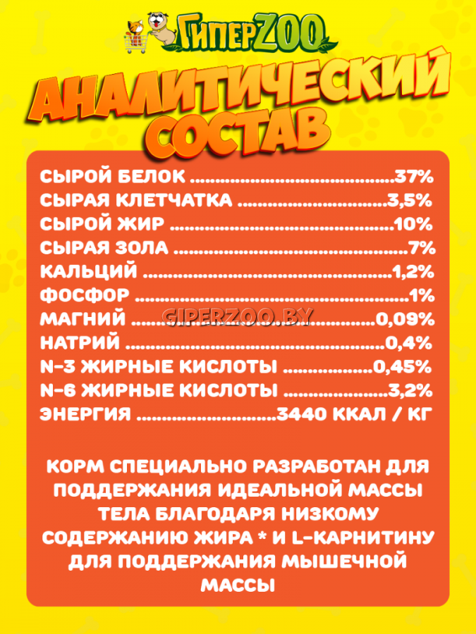 Аналитический состав: сырой белок: 37%, сырая клетчатка: 3,5%, сырой жир: 10%, сырая зола: 7%, кальций: 1,2%, фосфор: 1%, магний: 0,09%, натрий: 0,4%, n-3 жирные кислоты: 0,45%, n-6 жирные кислоты: 3,2% метаболическая энергия (модифицированная вода): 3,440 ккал / кг.