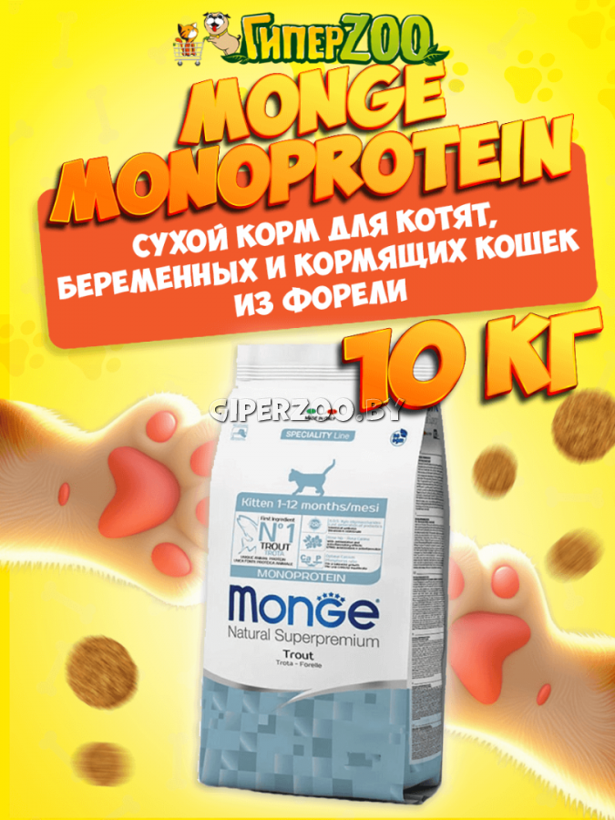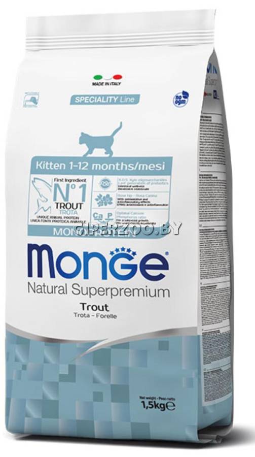Monge Cat Monoprotein Kitten (Форель) - это монобелковый корм для котят с форелью. Сбалансированное содержание кальция и фосфора для поддержки роста котенка. Составлен с уникальным источником животного белка (форель), обогащенным естественными пребиотиками, которые сохраняют здоровье кишечника.