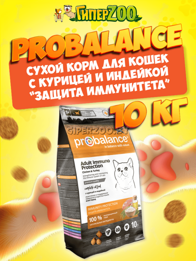 Probalance Cat Immuno Chicken & Turkey - полнорационный сбалансированный сухой корм премиум класса для взрослых кошек всех пород, с курицей и индейкой. Природные антиоксиданты и лизин, содержащиеся в гранулах кормов серии ProBalance® Immuno, способствуют укреплению иммунитета. Специально подобранный пребиотик поддерживает полезную микрофлору кишечника, а глюкозамин и хондроитин помогают сохранить суставы здоровыми. Оптимальный баланс питательных и минеральных веществ предотвращает возникновение заболеваний опорно-двигательного аппарата.