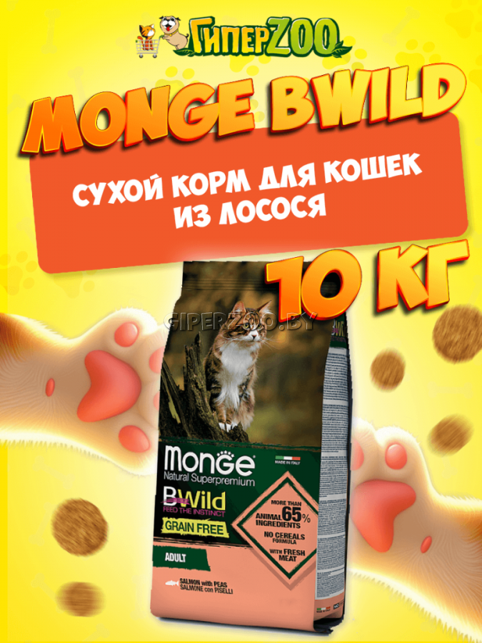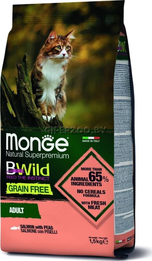 Monge Cat Bwild Grain Free (Лосось) — это полноценный сбалансированный рацион из лосося с добавлением альтернативных источников углеводов, таких как: картофель и чечевица, для взрослых кошек.