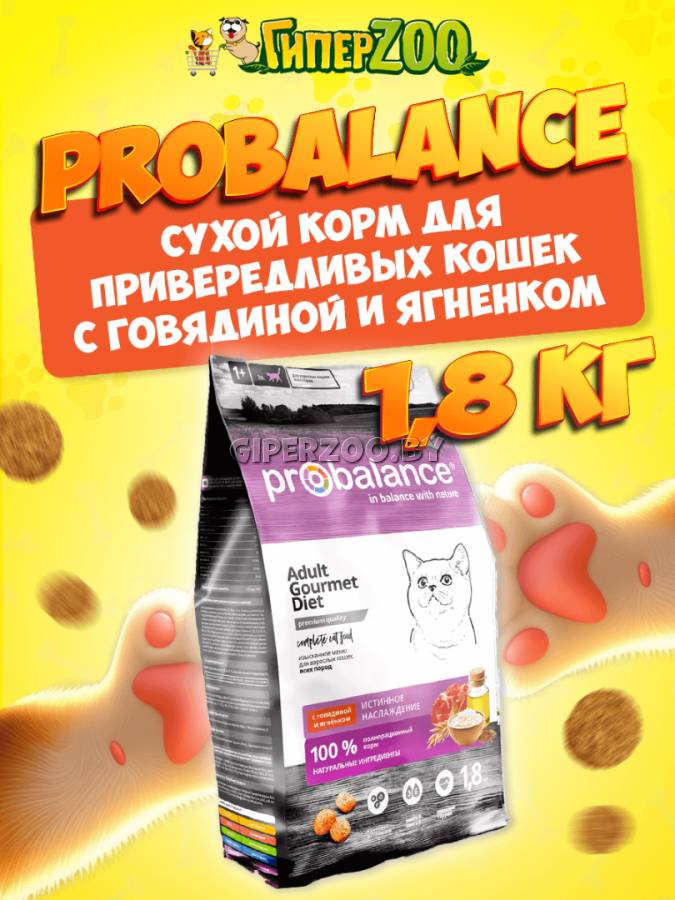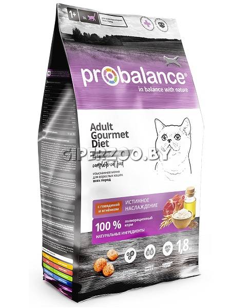 Probalance Gourmet diet Adult Cat (говядина, ягненок)- полнорационный натуральный сухой корм премиум класса для кошек, избирательных в еде. Основной ингредиент корма – мясо двух видов: говядина и ягненок. Рацион рекомендован для ежедневного кормления взрослых кошек всех пород. Корм Gourmet Diet Beef & Lamb разработали датские ветеринары для требовательных кошек. Особенности сухого корма для кошек Probalance Gourmet: · В состав корма входит сразу два источника животного белка – говядина и ягненок. Мясо говядины и ягненка не только удовлетворяет вкусовые пристрастия привередливых питомцев, но и обеспечивает организм животного незаменимыми аминокислотами, витаминами и минеральными веществами. · Специально подобранный пребиотик поддерживает полезную микрофлору кишечника. · Глюкозамин и хондроитин помогают сохранить суставы здоровыми. · В составе корма нет курицы, поэтому рацион подходит питомцам с аллергией на куриный белок.
