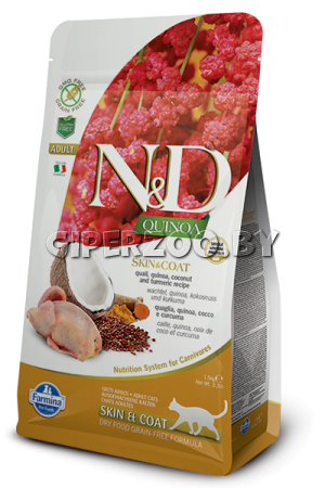 Farmina N&D Quinoa Adult Cat Skin & Coat (перепелка с кокосом), 300 гр - полнорационный диетический сухой корм для взрослых кошек, рекомендуемый при пищевой непереносимости. Здоровье кожи и шерсти. В состав входит свежий перепел, добавлены куркума, кокос, киноа, а также другие полезные для здоровья компоненты.
