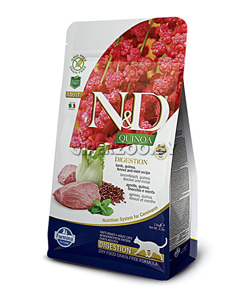 Farmina N&D Quinoa Adult Cat Digestion (ягненок с фенхелем), 1,5 кг - полнорационный диетический корм для взрослых кошек, рекомендуемый при нарушениях пищеварения. В состав входит ягненок, добавлены киноа, фенхель, мята, а также другие полезные для организма компоненты.