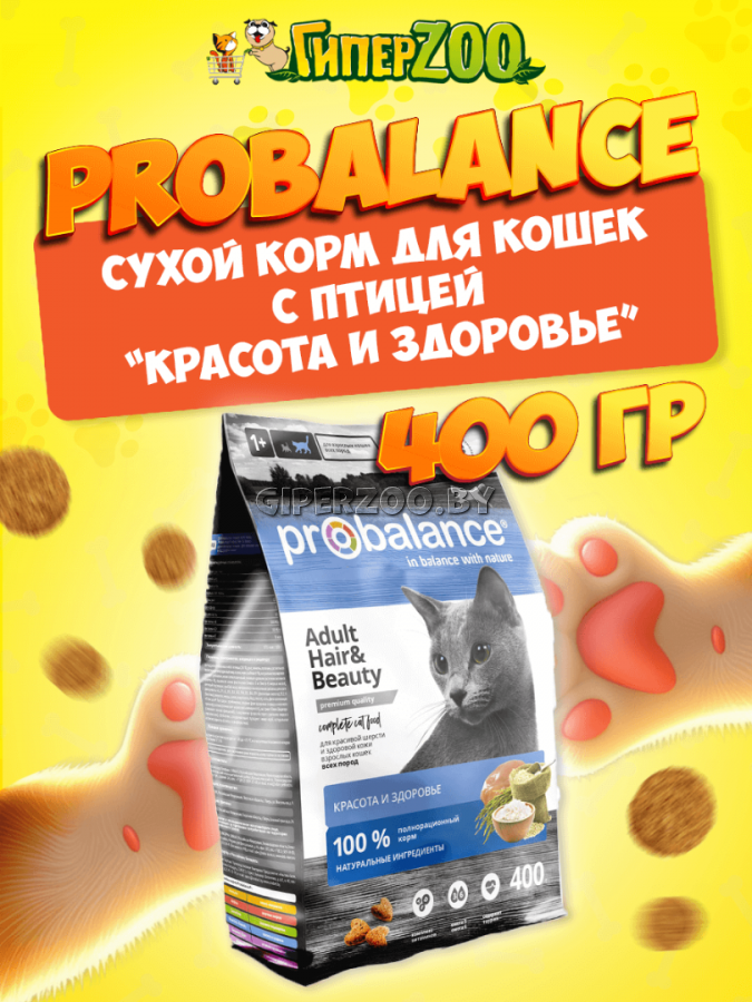 Сухой корм для котов ProBalance Cat Hair&Beauty, 400 гр - полнорационный сбалансированный сухой корм премиум класса для взрослых кошек всех пород для красоты и здоровья шерсти и кожи. Корма ProBalance® Beauty особенно рекомендуется в период подготовки к выставкам.