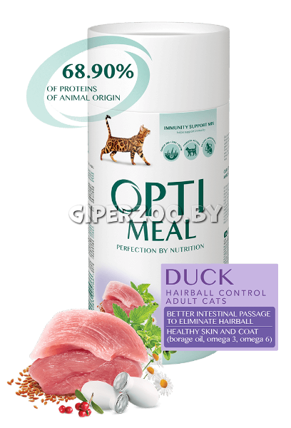Optimeal для кошек с эффектом выведения шерсти (Утка) - это корм для взрослых кошек с эффектом выведения шерсти. - Натуральная нерастворимая клетчатка улучшает кишечную проходимость и способствует мягкому выведению шерсти естественным путем, не образуя комков в желудке - Свежее мясо утки в виде фарша обеспечивает кота высококачественным легкоусвояемым протеином животного происхождения, способствует здоровому пищеварению - Содержит комплекс для укрепления иммунитета Immunity Support Mix, полезные травы, ягоды, натуральные антиоксиданты и пребиотики - Омега-3 и 6, цинк, биотин помогают поддерживать кожу кота здоровой, а шерсть блестящей - Содержит 68,90% протеинов животного происхождения