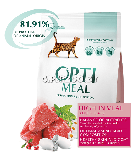 Optimeal для взрослых кошек (телятина), 10 кг - это корм для взрослых кошек с высоким содержанием телятины.