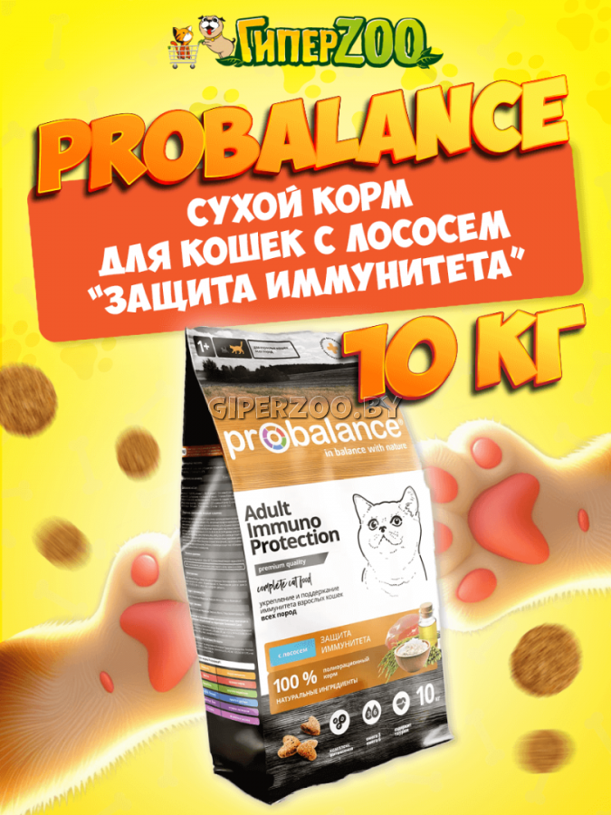 ProBalance Cat Immuno Salmon. Полнорационный сбалансированный сухой корм премиум класса для взрослых кошек всех пород с лососем. Защищает и поддерживает иммунитет. Природные антиоксиданты и лизин, содержащиеся в гранулах корма, способствуют укреплению иммунитета. Специально подобранный пребиотик поддерживает полезную микрофлору кишечника, а глюкозамин и хондротин помогают сохранить суставы здоровыми. Оптимальный баланс питательных и минеральных веществ предотвращает возникновение заболеваний опорно-двигательного аппарата.