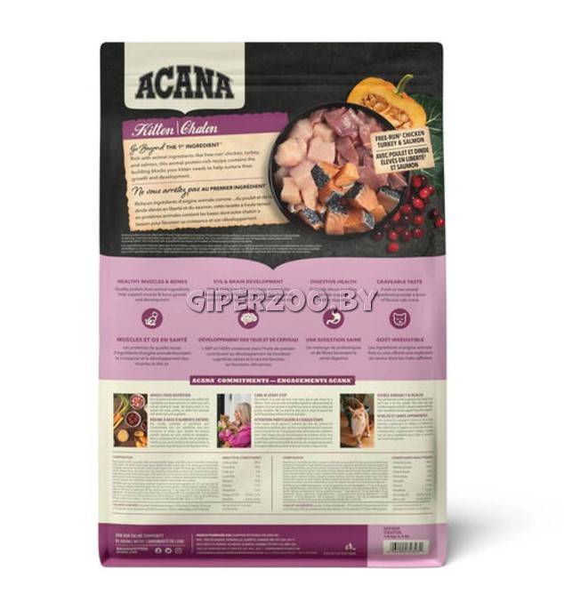 Acana Highest Protein Kitten GF, 1,8 кг - сухой корм со вкусом птицы и лосося.