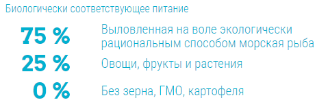 Свежая цельная сельдь (16%), свежая цельная тихоокеанская сардина (13%), свежая цельная камбала (8%), дегидрированная цельная сельдь (8%), дегидрированное мясо тихоокеанской трески (8%), дегидрированный цельный хек (8%), цельный зеленый горошек, цельная красная чечевица, цельный нут, цельная зеленая чечевица, жир сайды (6%), свежий цельный серебристый хек (4%), свежий цельный морской окунь (4%), цельная фасоль, цельный желтый горошек, подсолнечное масло холодного отжима, вяленная на солнце люцерна, сухие бурые водоросли, свежая столовая тыква, свежая мускатная тыква, свежий пастернак, свежая листовая капуста, свежий шпинат, свежие листья горчицы, свежая зелень репы, свежая морковь, свежие яблоки сорта «Ред Делишес», свежая груша сорта «Бартлетт», сублимированная печень трески (0,1%), свежая клюква, свежая черника, корень цикория, куркума, расторопша, корень лопуха, цветы лаванды, корень алтея, плоды шиповника.