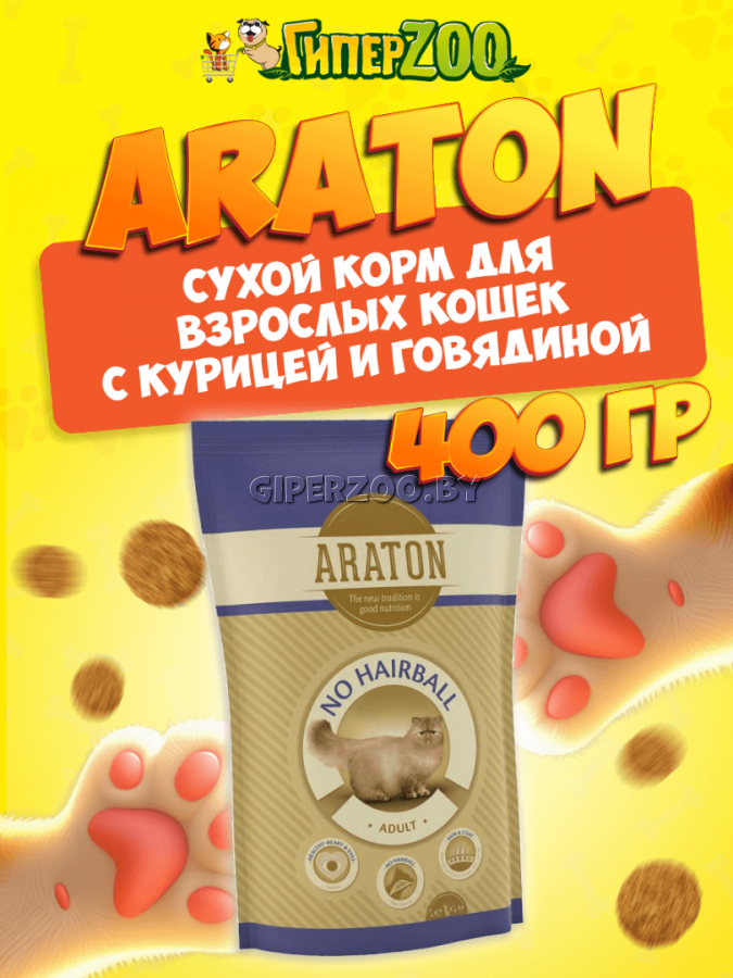 Корм для кошек Araton Adult No Hairball (курица, говядина), 0,4 кг - полноценный сухой корм, предназначенный для взрослых кошек, страдающих от образования волосяных шариков в кишечнике. Из-за образования волосяных шариков в кишечнике питомца может начать тошнить, его могут мучить проблемы с пищеварением – запоры или кишечная непроходимость. От образования волосяных шариков спасает кошачий корм, предназначенный для решения именно этой проблемы.
