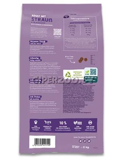 Состав: старая упаковка: свежая птица (мин.20%), рис, просо жёлтое, мука из мяса птицы, животный жир, жировая клетчатка (дегидратированная), печеночная мука, мука из мяса страуса (мин.4%), просо, белковый гидролизат, мясная мука, цельное яйцо (сухое), сушеная мякоть свеклы (без сахара), картофельный белок, льняное семя, целлюлозные волокна, рыбий жир, дрожжи (сухие), карбонат кальция, хлорид калия, клюква, черника (сушеная), мука из мяса мидий, порошок цикория, цветки календулы (сушеные), экстракт юкки.
