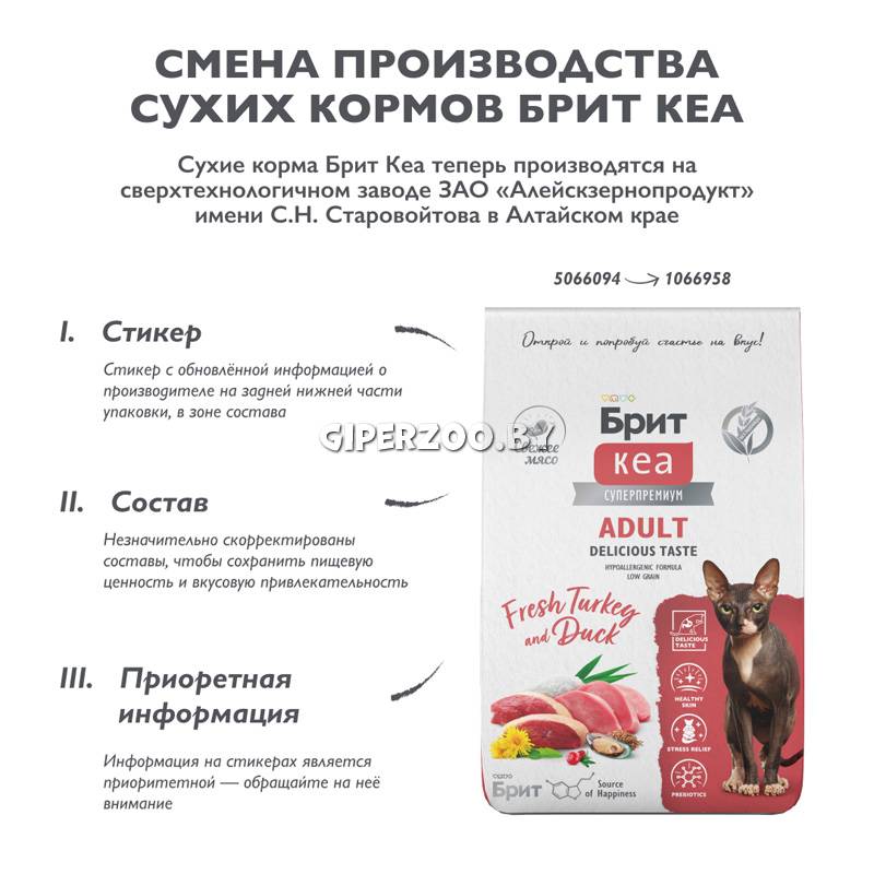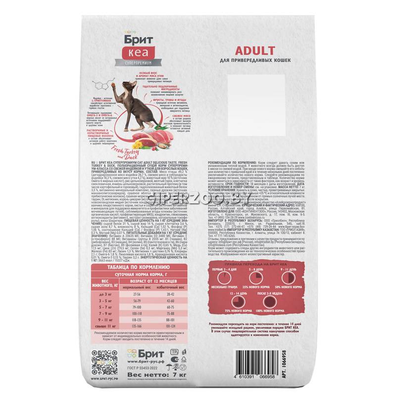 Брит Кеа Сухой корм для взрослых кошек (индейка и утка) - корм для привередливых кошек разработан для удовлетворения потребностей взрослых кошек, отличающихся избирательностью в питании. Его уникальная формула сочетает в себе вкусные и легкоусвояемые источники белка — индейку и утку, что делает корм не только питательным, но и привлекательным для привередливых питомцев. Корм содержит витамины и минералы, поддерживающие общее здоровье, а также жирные кислоты, улучшающие состояние кожи и шерсти. Высокое содержание свежего мяса обеспечивает кошкам энергию и активность на протяжении дня. Брит Кеа Delicious Taste — это отличный выбор для поддержания здоровья и активности кошек с особыми вкусовыми предпочтениями, обеспечивая им полноценное и сбалансированное питание.