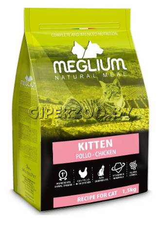 Meglium Kitten с курицей содержит 36% мяса курицы, обеспечивающего питательные белки, и 4% муки форели, добавляющей полезные Омега-3 жирные кислоты.