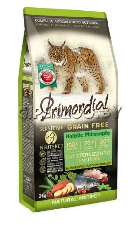 Primordial Cat Adult Neutered Sensitive (Лосось) — беззерновой корм взрослых стерилизованных кошек c чувствительным пищеварением с гидролизованным лососем (лосось - 35%, перепел - 15%).