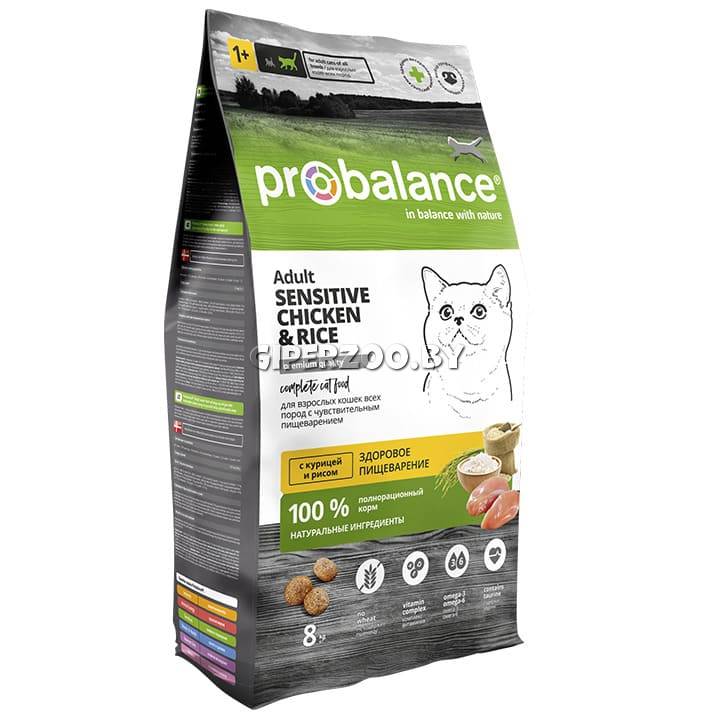 ProBalance Sensitive Adult Cat, 8 кг – полнорационный сбалансированный сухой корм премиум класса для взрослых кошек всех пород с чувствительным пищеварением, с курицей и рисом.