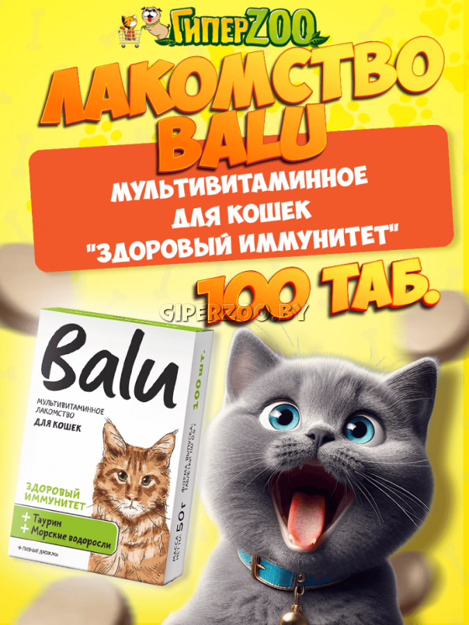 Мультивитаминное Лакомство BALU для кошек «Здоровый иммунитет» морские водоросли BALU – это вкусное и полезное лакомство, которое дополнит ежедневный рацион вашего питомца. С помощью лакомства вы можете не только баловать питомца, но и заботиться о его здоровье, ведь в состав лакомства входят питательные и полезные вещества, стимулирующие работу всех систем организма.