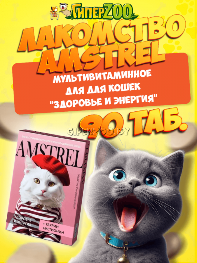 Лакомство мультивитаминное Amstrel для кошек "Здоровье и энергия" таурин и метионин, 90 таб. - натуральная пищевая добавка, источник витамин, аминокислот, макро- и микроэлементов, антиоксидантов.