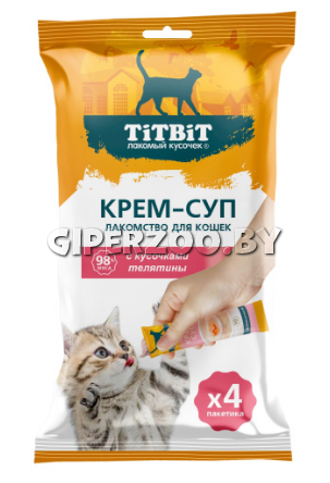 Крем-суп для кошек TITBIT – это специально разработанные вкусные и полезные продукты, которые: содержат кусочки свежего мяса, содержат 98% мясных ингредиентов, содержат дополнительные полезные ингредиенты (таурин для поддержки зрения, сердца, пищеварительной, половой и иммунной систем; морковь для поддержки зрения и пищеварения; петрушка для поддержки мочеполовой, сердечно-сосудистой и пищеварительной систем).