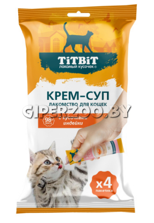 Крем-суп для кошек TITBIT – это специально разработанные вкусные и полезные продукты, которые: содержат кусочки свежего мяса, содержат 98% мясных ингредиентов, содержат дополнительные полезные ингредиенты (таурин для поддержки зрения, сердца, пищеварительной, половой и иммунной систем; морковь для поддержки зрения и пищеварения; петрушка для поддержки мочеполовой, сердечно-сосудистой и пищеварительной систем).
