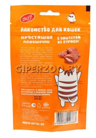 Хрустящие подушечки для кошек с паштетом из курицы – это вкусное и полезное лакомство. Паштет, содержащийся внутри каждой подушечки, имеет мягкую однородную консистенцию в виде мусса и неповторимый нежный вкус. Благодаря бережной технологии изготовления паштета, удалось сохранить полезные свойства мяса курицы, поэтому лакомство богато ценным белком, важнейшими минералами и витаминами.