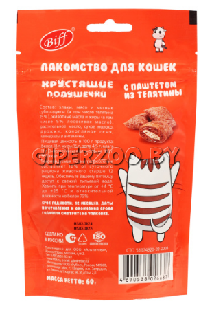 Хрустящие подушечки для кошек с паштетом из телятины – это вкусное и полезное лакомство. Паштет, содержащийся внутри каждой подушечки, имеет мягкую однородную консистенцию в виде мусса и неповторимый нежный вкус. Благодаря бережной технологии изготовления паштета, удалось сохранить полезные свойства телятины, поэтому лакомство богато ценным белком, важнейшими минералами и витаминами.