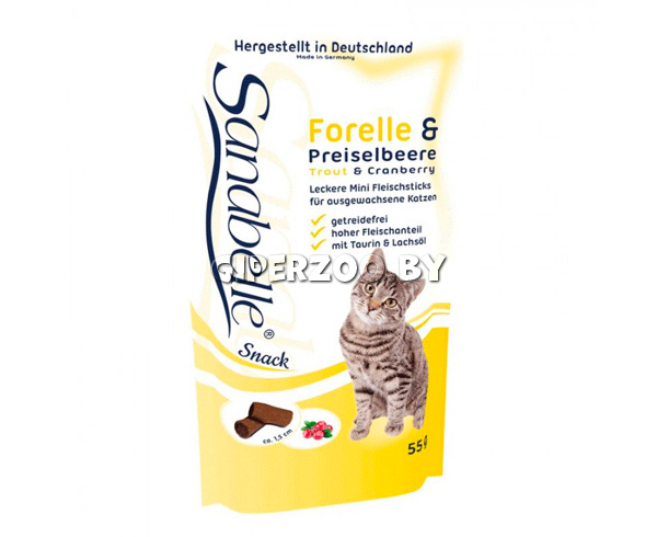 Лакомство Sanabelle CAT STICKS TROUT & CRANBERRY содержит больше количество белка животного происхождения и великолепно подходит как дополнительное питание или поощрение кошек. Лакомство насыщено питательными веществами и минералами, позволяет кошкам получать дополнительную энергию и питательные вещества. Особый состав лакомства благоприятно влияет на шерсть и кожу кошки. Благодаря полувлажной структуре и высокому содержанию мясных компонентов, обладает великолепными вкусовыми качествами.