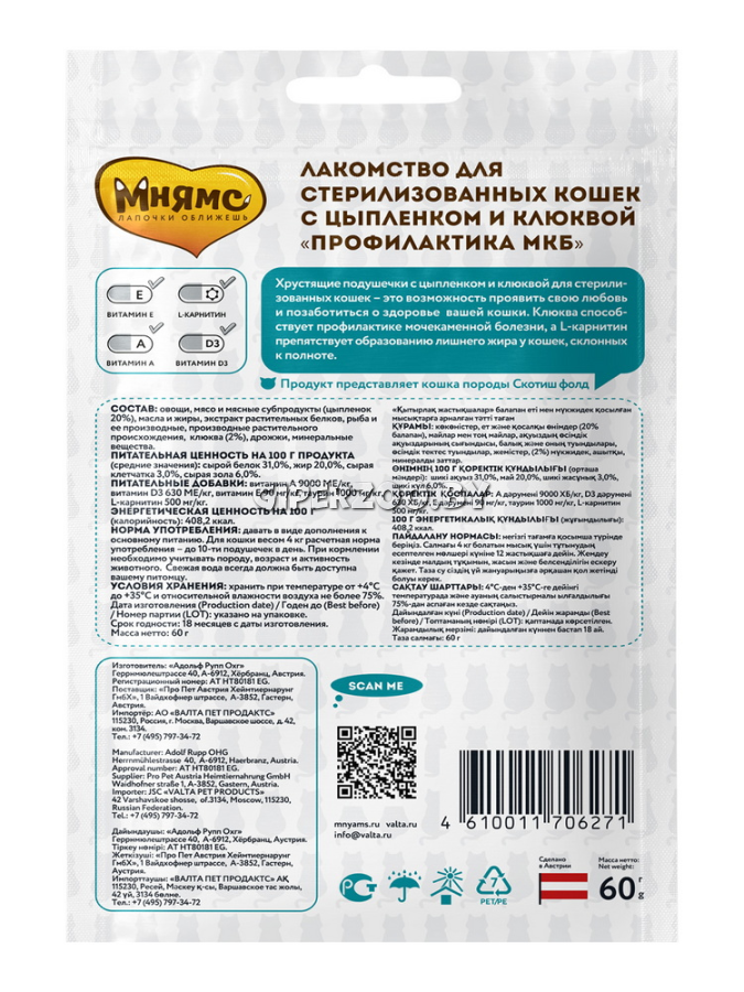 Мнямс хрустящие подушечки для стерилизованных кошек с цыпленком и клюквой "Профилактика МКБ", 60г - это изысканное и полезное угощение, от которого не откажется даже самая привередливая и избалованная кошка.