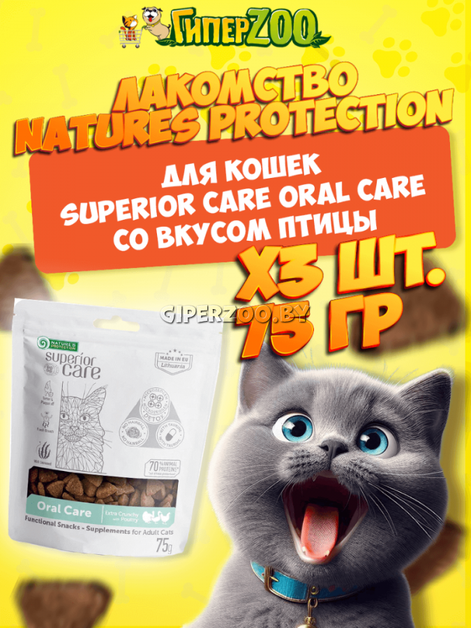 Лакомства Nature's Protection Superior Care Oral Care – это высококачественная добавка к корму, предназначенная для взрослых кошек Состав: мясо птицы 42% (сушеное и мелко измельченное), рис, кукуруза, кукурузная клейковина, птичий жир, жом сахарной свеклы, полифосфат натрия (2%), морские водоросли Ascophyllum nodosum (2%), целлюлоза (1, 5%), пивные дрожжи, семена льна, динамический микронизированный клиноптилолит (1%), рыбная мука, сухие яйца, маннанолигосахариды (МОС), экстракт цикория, юкки мохаве, шрот календулы. Аналитический состав: сырой протеин – 32 %, сырая клетчатка – 4 %, сырой жир – 10 %, сырая зола – 6,5 %, кальций – 1 %, фосфор – 0,9 %, калий – 0,9 %, натрий – 0,5 %, магний – 0,06 %, Омега-3 жирные кислоты – 0,24 %, Омега-6 жирные кислоты – 2,58 %.