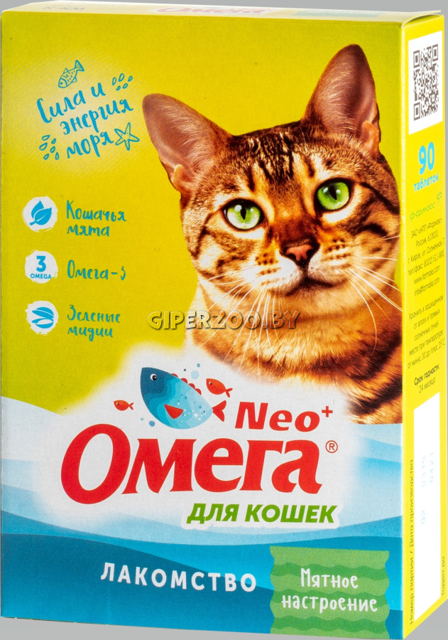 Омега Neo+ Мятное настроение лакомство мультивитаминное с кошачьей мятой для кошек. Кошачья мята снимает стресс, улучшает поведение и настроение кошек. Новозеландские зеленые мидии укрепляют хрящевую ткань суставов. Омега-3 кислоты поддерживают иммунитет и улучшают состояние кожи и шерсти. Пивные дрожжи – натуральный источник витаминов группы В.