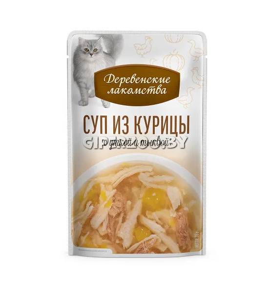 Деревенские лакомства Суп из курицы (утка, тыква). 35 гр*4 шт - нежнейшее филе курицы, утка и тыква получили идеальное сочетание с густым бульоном в супе для кошек.