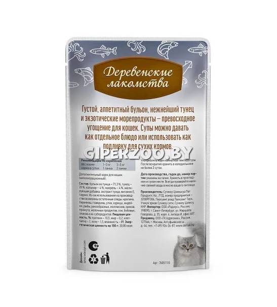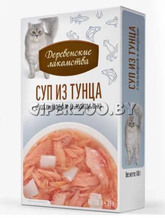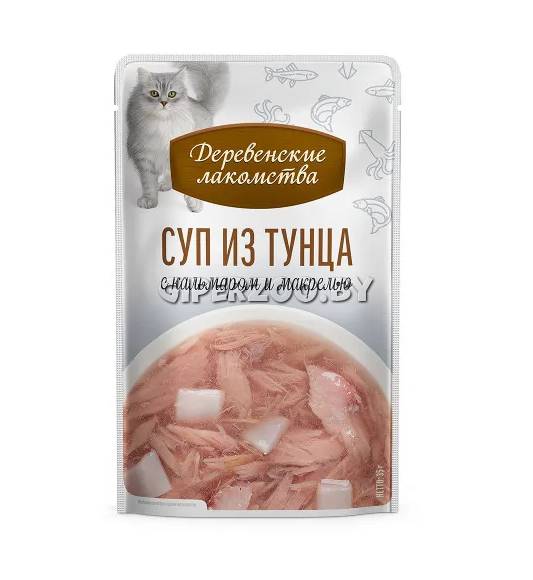 Деревенские лакомства Суп из тунца (кальмар, макрель), 35 гр*4 шт - густой аппетитный бульон с нежнейшим тунцом, кальмаром и макрелью — превосходное угощение для кошек.