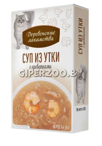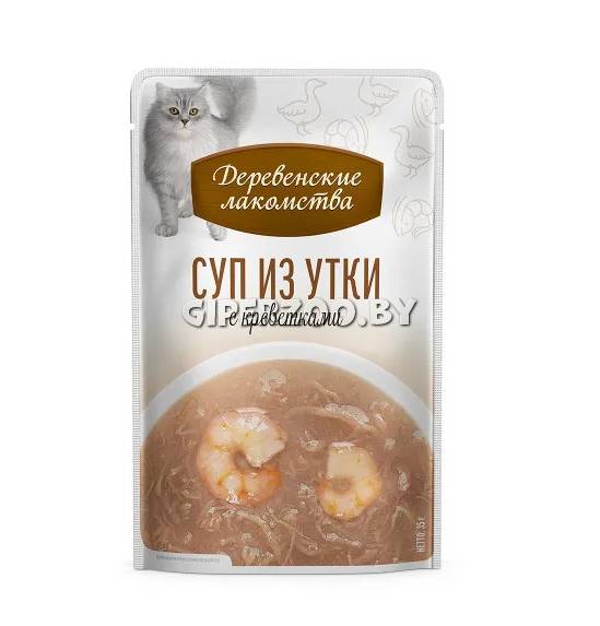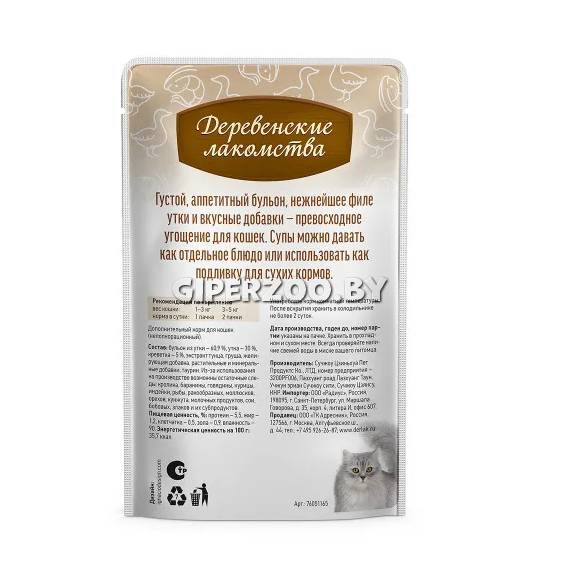Ингредиенты: Бульон из утки 60,9%, утка 30%, креветка 5%, экстракт тунца, груша, желирующая добавка, растительные и минеральные добавки. Из-за использования на производстве возможны остаточные следы: кролика,баранины,говядины, курицы, индейки, рыбы, ракообразных, маллюсков, орехов, кунжута, молочных продуктов, сои, бобовых, злаков и их субпродуктов. Аналитический состав: Пищевая ценность на 100 г продукта, %: протеин — 5,5, жир — 1,2, клетчатка — 0,5, зола — 0,9, влажность — 90; энергетическая ценность — 35,7 ккал.
