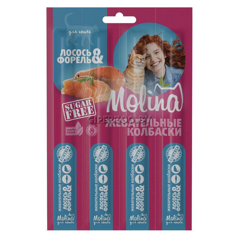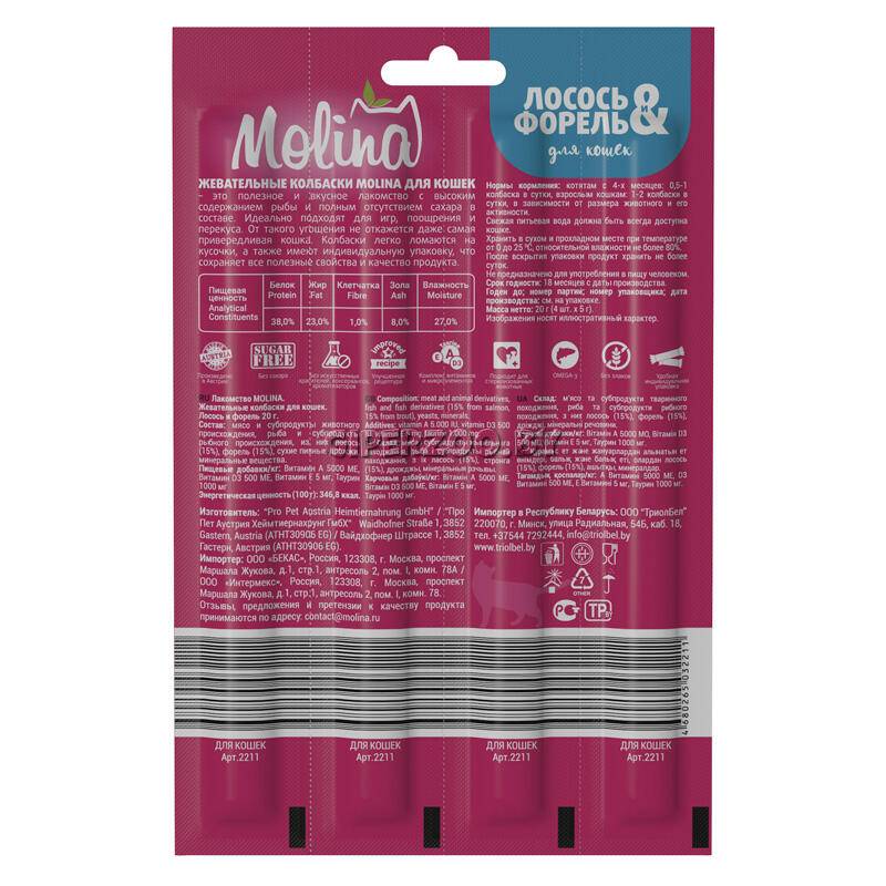 Мясо и субпродукты животного происхождения, рыба и субпродукты рыбного происхождения, из них лосось 15%, форель 15%, сухие пивные дрожжи, минеральные вещества.