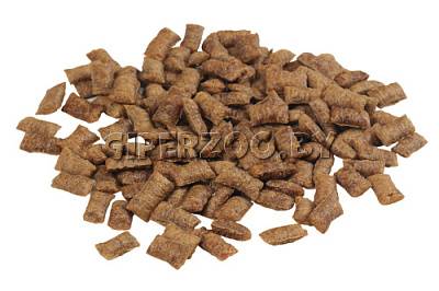 Состав: злаки, мясо и мясные субпродукты (в том числе говядина 15%), животные масла и жиры, яичный порошок, дрожжи, сухое молоко, клюква, минералы и витамины.