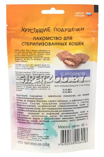ТИТБИТ Хрустящие подушечки для стерилизованных кошек (кролик), 60 гр – идеальное лакомство для вашей стерилизованной кошки! Теперь вы можете баловать своего питомца, и заботиться о его здоровье. Состав подушечек разработан с учетом физиологических особенностей стерилизованных кошек и кастрированных котов. Для поддержания здоровья мочевыводящей системы добавлены функциональные ингредиенты: клюква - защищает от инфекций мочевыводящих путей и регулирует кислотность мочи; DL метионин помогает расщеплению жиров и способствует меньшему образованию фосфатных солей, которые, накапливаясь, могут приводить к развитию МКБ у питомцев.
