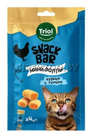 Triol Snack Bar Мини-роллы с начинкой из курицы с тунцом — аппетитные рулетики с нежной начинкой. Мягкая текстура и яркий вкус сделают угощение любимым лакомством питомца. Лакомство содержит в себе полезные ингредиенты для активной жизни питомца и станет отличным дополнением к основному рациону.