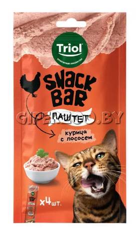 Triol Snack Bar Паштет из курицы с лососем — полезное и сытное угощение для кошек. Нежная текстура паштета, изысканный вкус и аромат непременно покорит вашего любимца. Сбалансированный состав лакомства укрепляет иммунитет и содержит в себе комплекс амминокислот, который необходим для здоровья кошек.