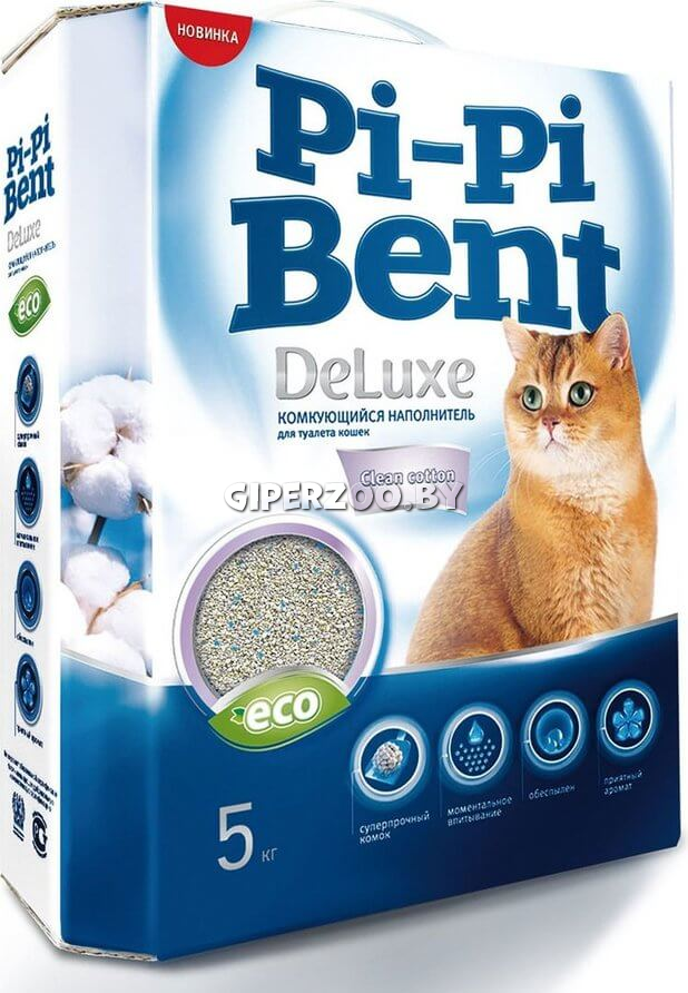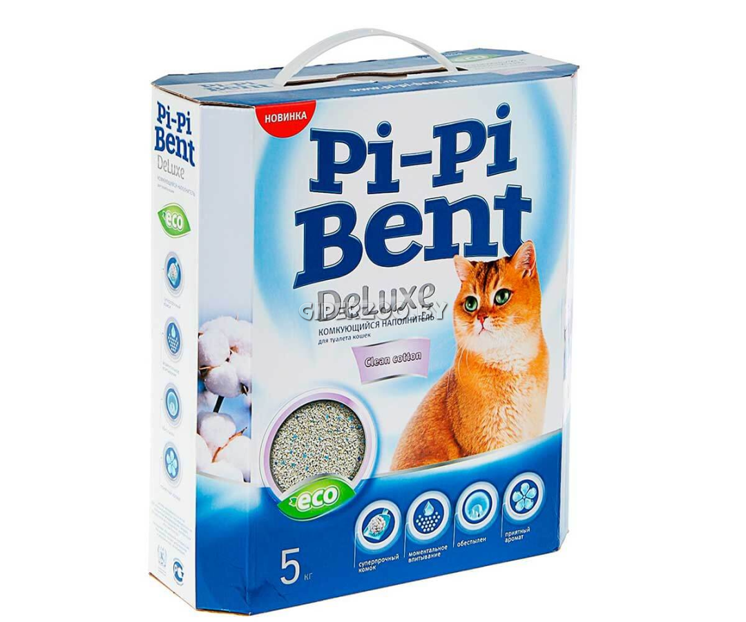 Наполнитель Pi-Pi Bent DeLuxe Clean Cotton — наполнитель, в котором используется отдушка с мягким, тонким и нежным ароматом чистого и свежего белья – ароматом чистого хлопка, который так любят кошки.