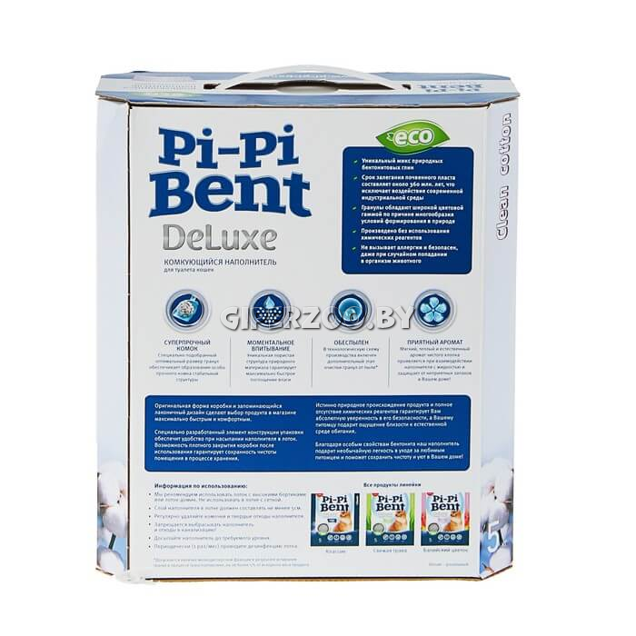 - Гранулы наполнителя Pi-Pi Bent DeLuxe проходят дополнительную стадию отчистки от пыли, что позволяет добиться минимальной пыльности.